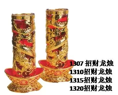 Home Ghee Crystal Candles 招财龙烛 招财龙烛 Product Description Code 名称 Burning Time 高度 庄数/合 对/箱 1303 招财龙烛 3日 13CM 1对 20对 1305 招财龙烛 5日 16CM 1对 12对 1307 招财龙烛 7日 22.5CM 1对 12对 1310 招财龙烛 10日 1对 6对 1315 招财龙烛 15日 1对 4对 1320 招财龙烛 20日 1对 3对 Related Products 元宝烛-黄(大悲咒) 添添发水晶旺烛 佛杯酥油烛